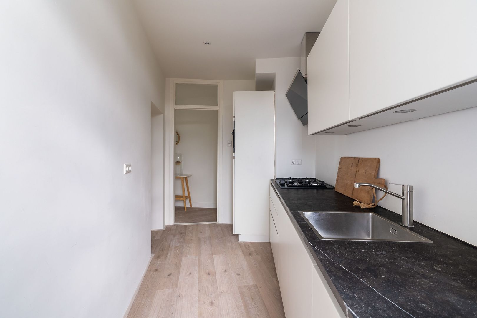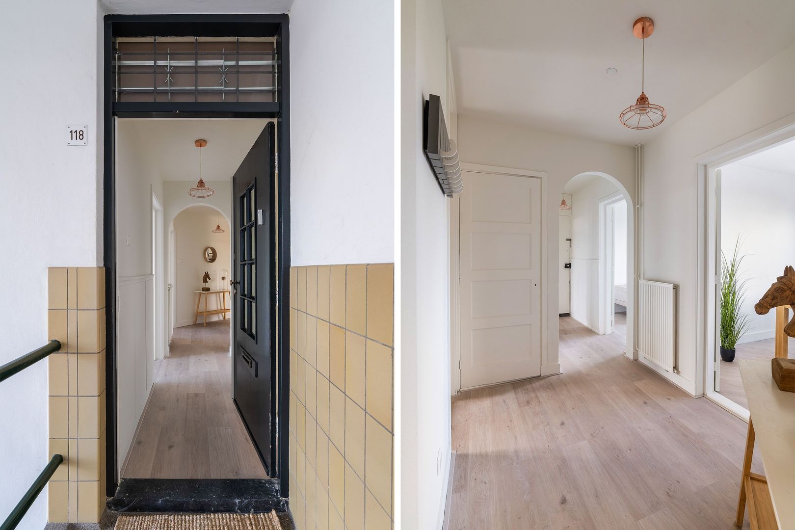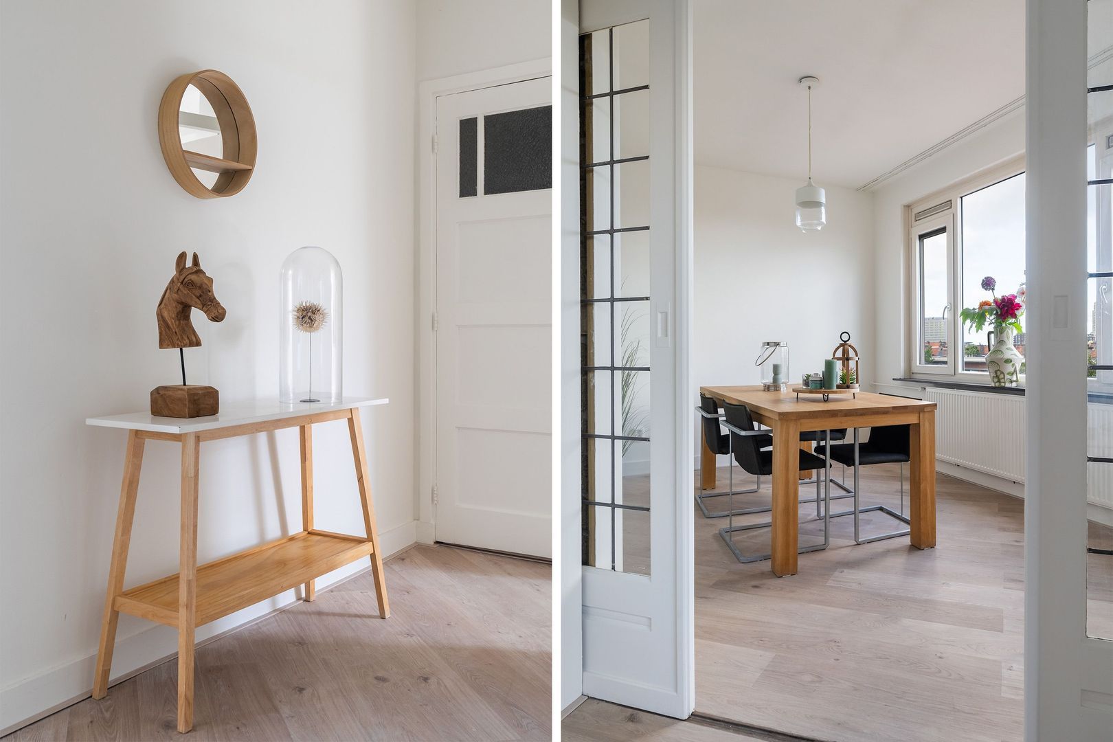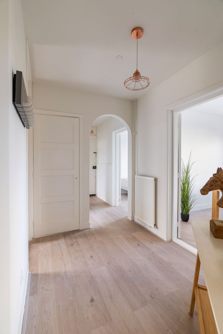 Woningentree via open portiek; hal met een vaste kast voorzien van de cv-opstelling en de meterkast; lichte woonkamer en suite een sfeervolle glas in lood schuifseparatie, vaste kasten en een met wijds uizicht; splinternieuwe moderne keuken met een fraai stenen werkblad, gaskookplaat, afzuigkap, combimagnetron/-oven, koel-vriescombinatie, vaatwasser en toegang tot het balkon; 1e slaapkamer aan de voorzijde; 2e slaapkamer aan de achterzijde met een vaste kast en toeagng tot het balkon; royale nette badkamer met inloopdouche, ligbad, wastafelmeubel, wasmachine aansluiting en toegang tot het balkon;