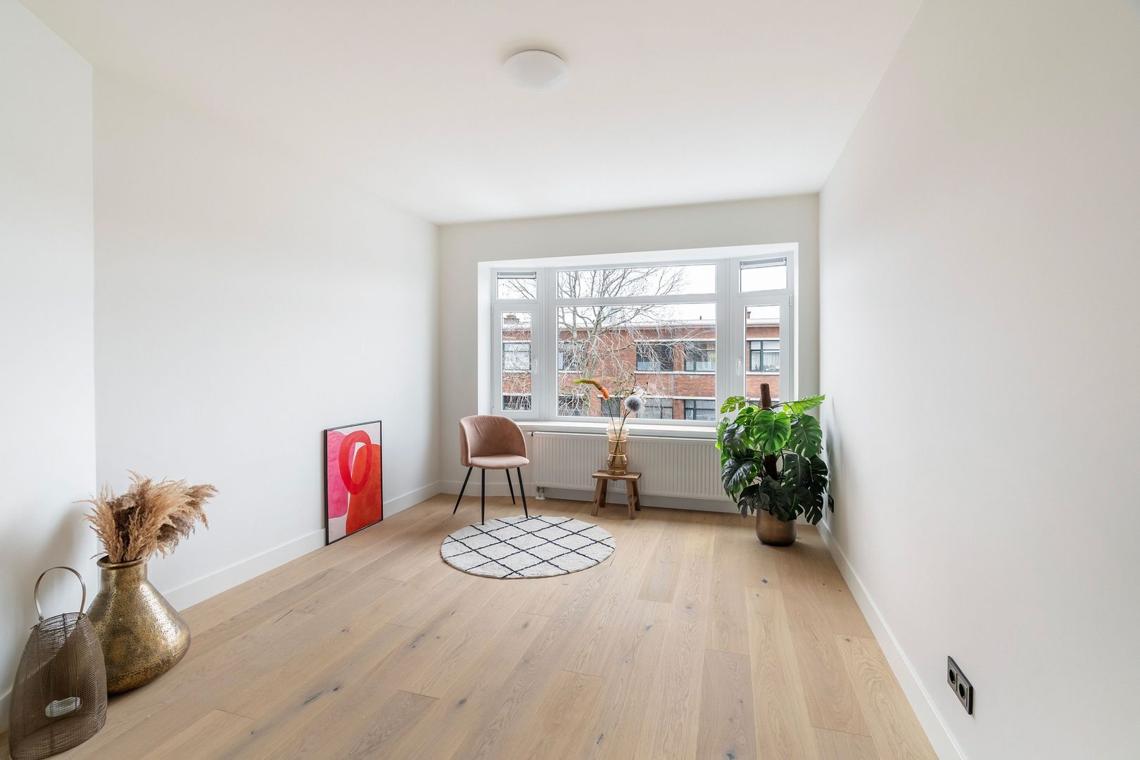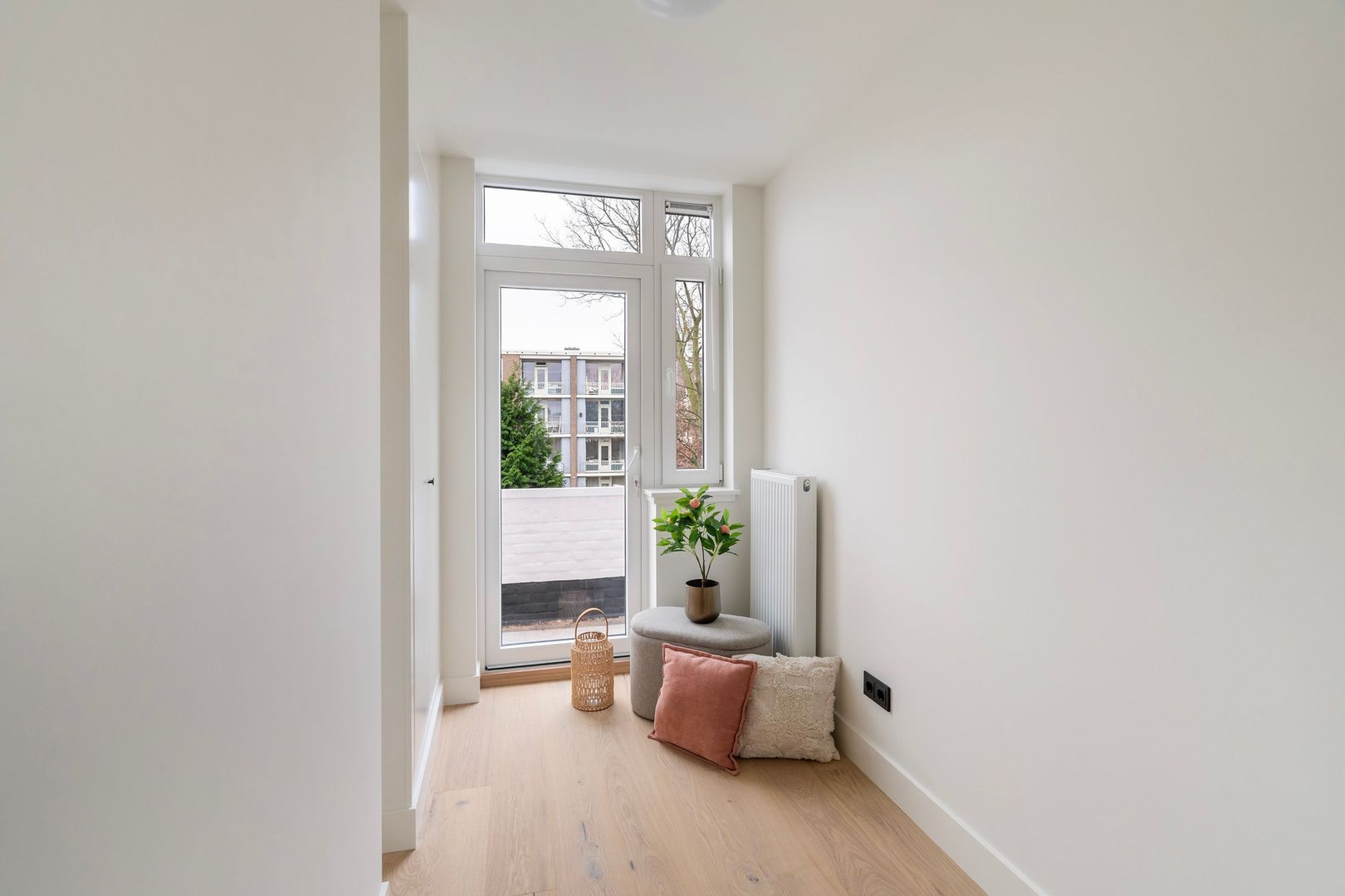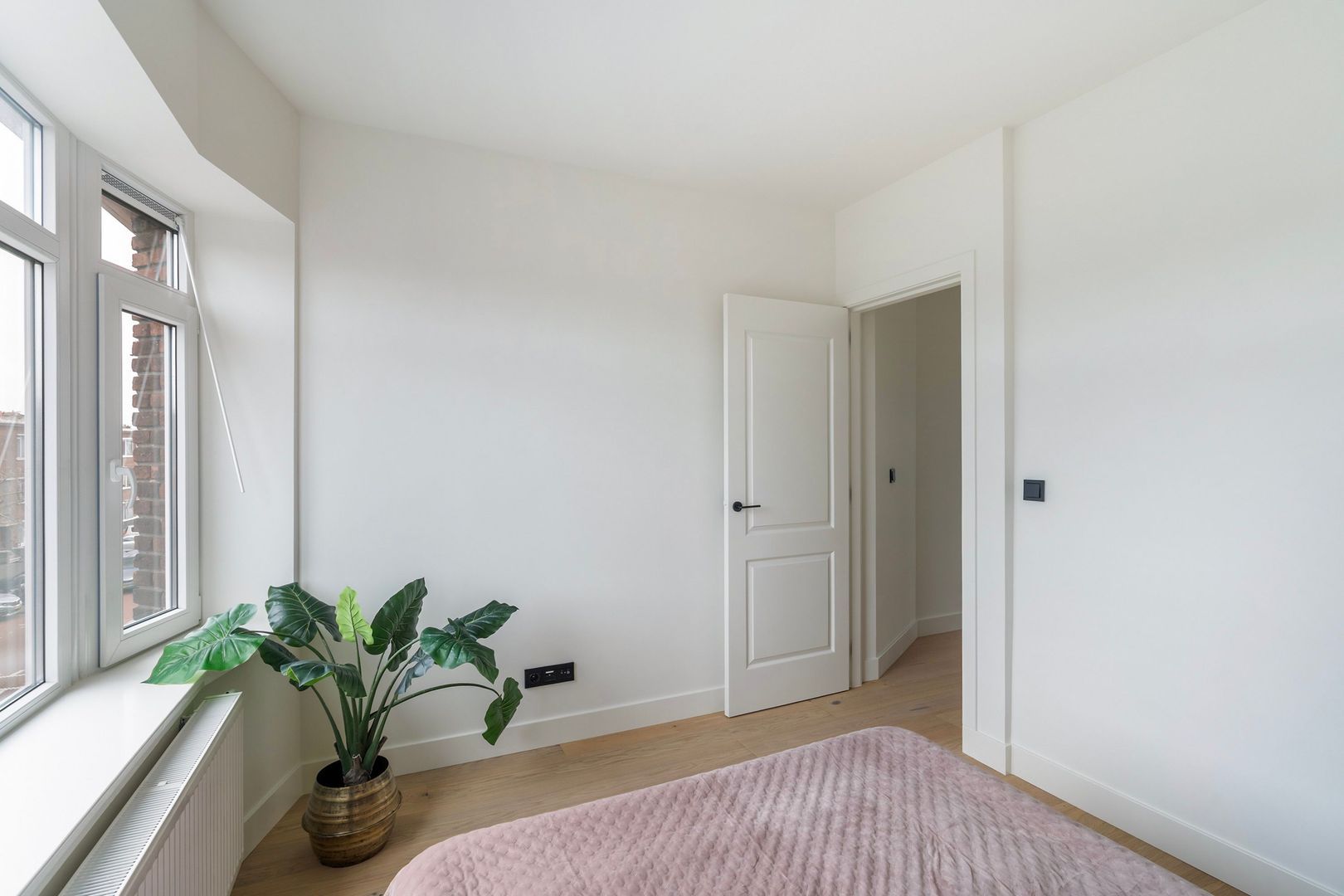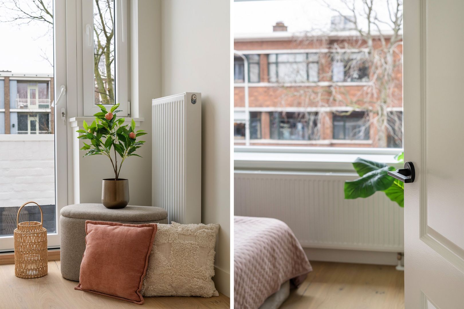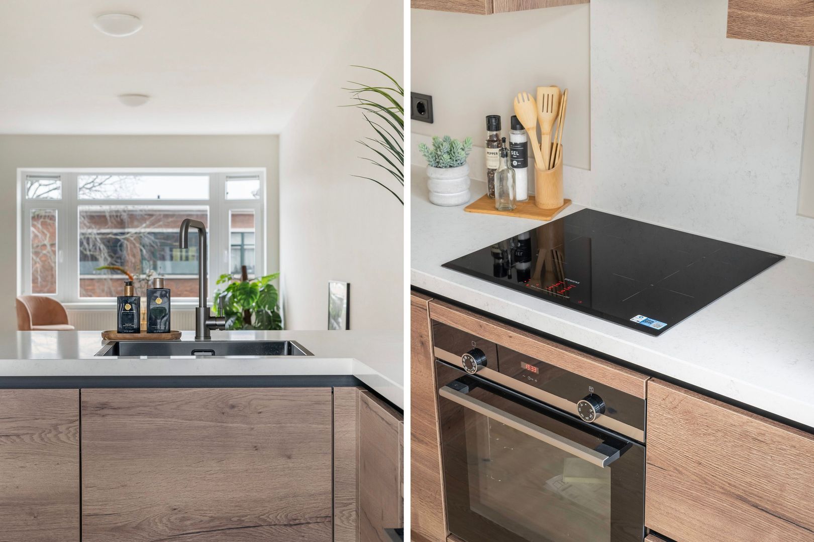 Open portiek naar de entree op de 1e etage; hal met meterkast, binnentrap naar de woningentree op de 2e etage; ruime hal met een toegang tot alle vertrekken; dubbele deuren naar de riante woonkamer met een luxe open keuken voorzien van een inductiekookplaat met afzuigkap, oven-magnetroncombinatie, koel-vriescombinatie en een vaatwasser; 1e slaapkamer aan de voorzijde; 2e slaapkamer aan de achterzijde met openslaande deuren naar het balkon; 3e slaapkamer aan de achterzijde met vaste kast met opstelplaats cv-ketel en toegang tot het balkon; balkon over de gehele breedte met vaste kast; moderne badkamer met wastafel met dubbele kranen, handdoekradiator en inloopdouche; separaat toilet met fonteintje.