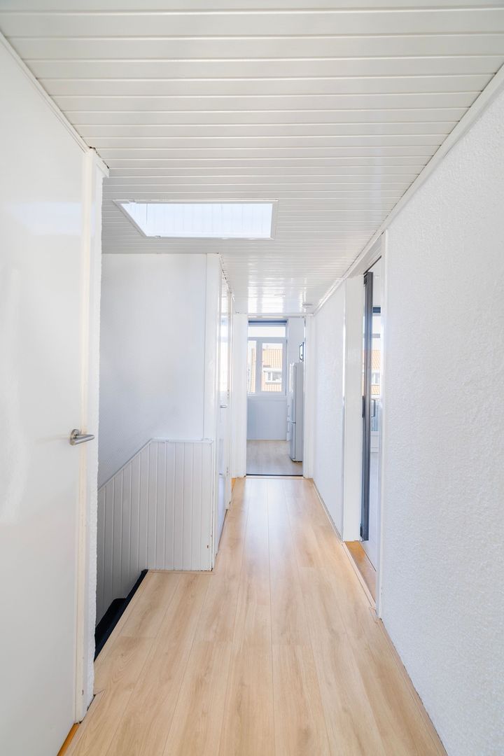 Woningentree via open portiek; hal met trap naar tweede etage, royale overloop; separaat toilet; riante woonkamer met toegang tot het zonnige balkon; nette keuken voorzien van een gaskookplaat, afzuigkap, oven, koelkast, vriezer en toegang tot het balkon; 1e slaapkamer aan de voorzijde met ruime raampartijen; 2e royale slaapkamer aan de achterzijde ; nette badkamer met wastafel en een inloopdouche; net separaat toilet;