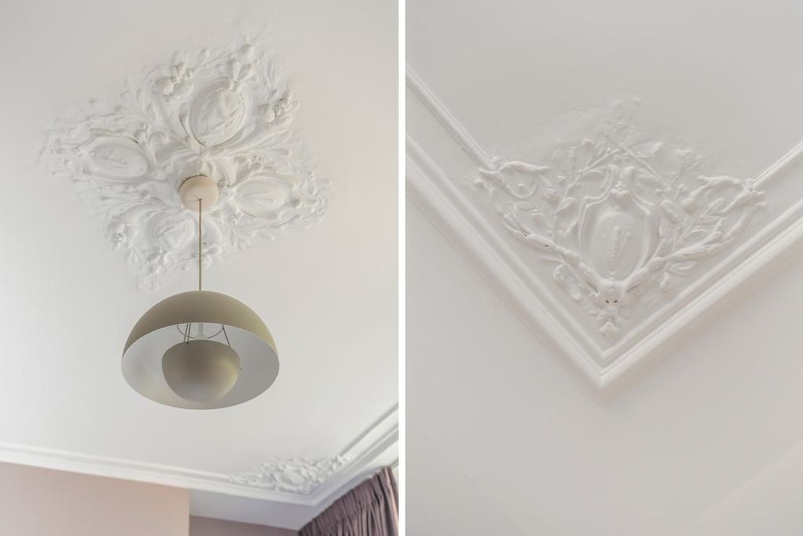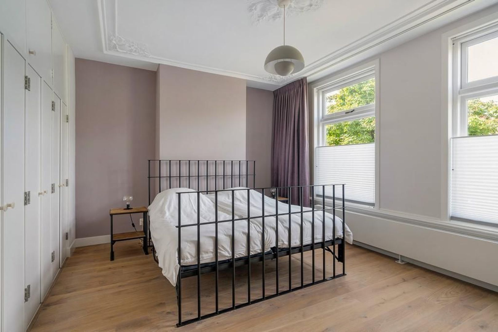 overloop; aan de voorzijde de master bedroom met kastenwand en fraai geornamenteerd plafond. 2e slaapkamer aan de achterzijde; luxe badkamer met half vrijstaand ligbad; wastafelmeubel, separate douche, 2e toilet. Ook deze etage is voorzien van eiken vloerdelen parket.
