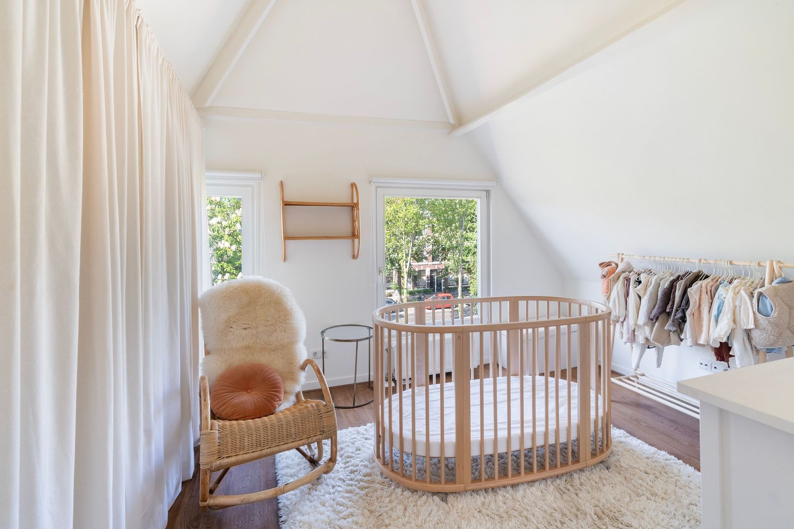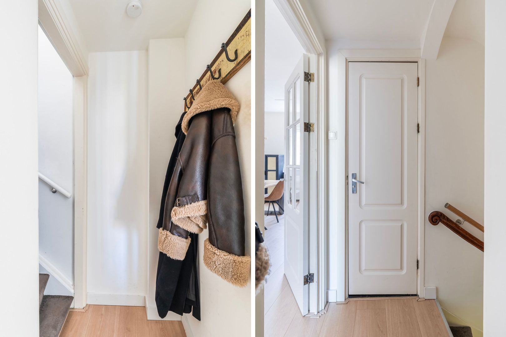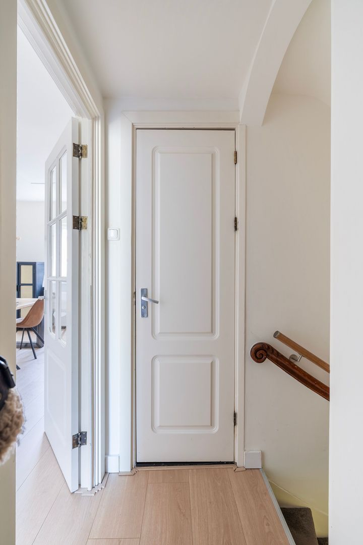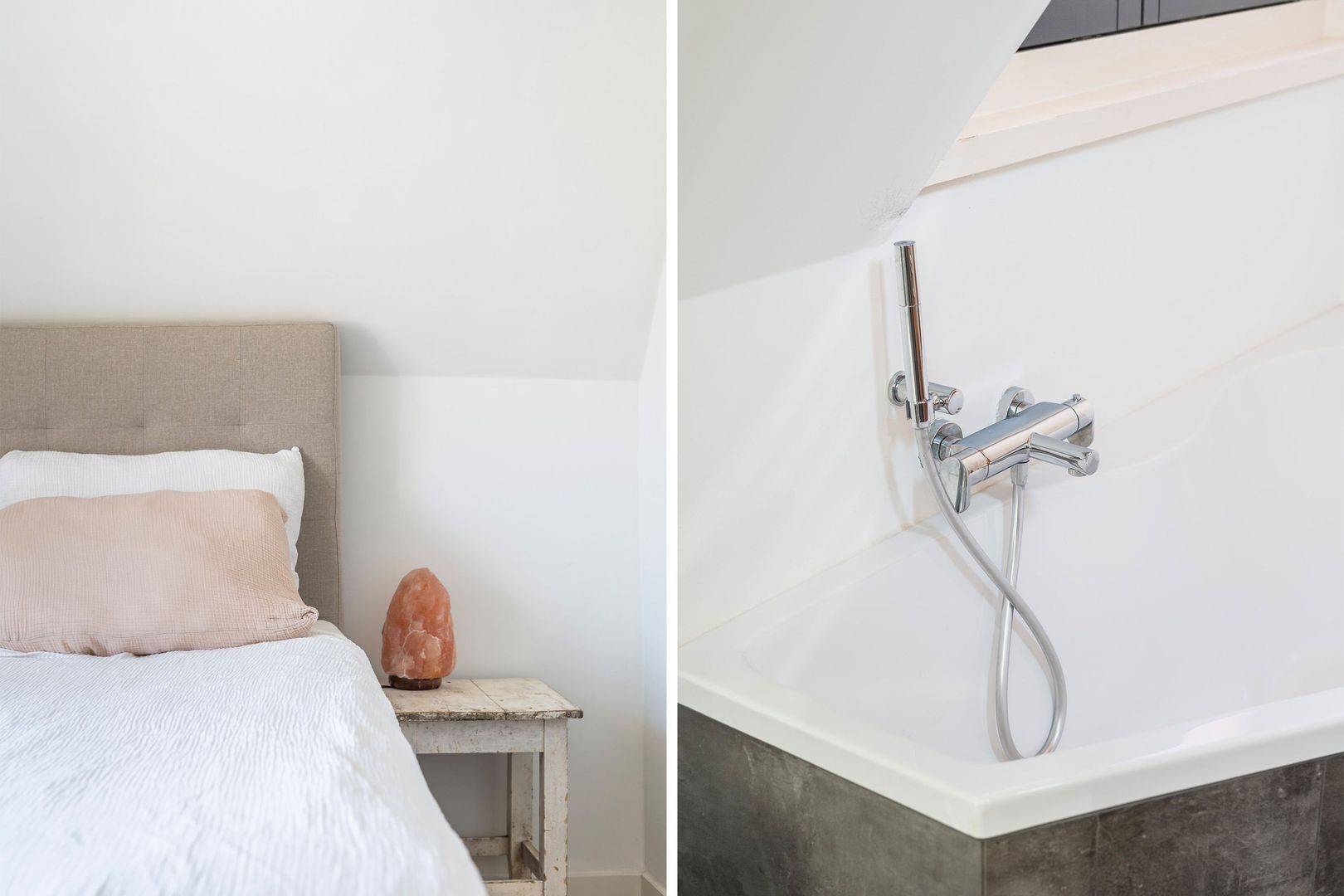 Trap naar de tweede etage; overloop met tegelvloer en opstelplaats cv ketel; en bergruimte; keurige sfeervolle achterkamer met dakkapel en voorzien van laminaatvloer; speelse semi open badkamer met vloerverwarming en voorzien van ruime inloopdouche met thermostaatkraan, fraai wastafelmeubel met waskom, ligbad, wandkast en dakraam; lichte voorkamer met een (nokhoogte 3.34) met laminaatvloer, balken plafond, bergruimte en twee raamkozijnen.
