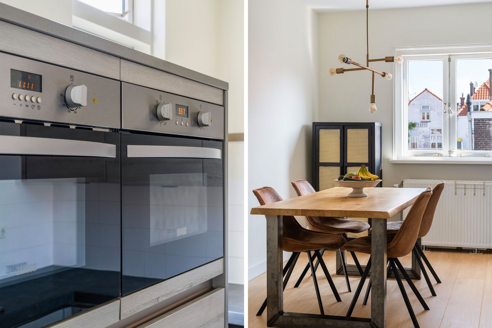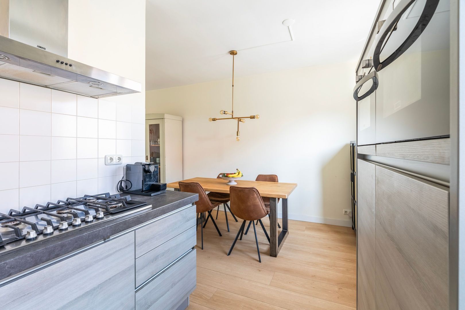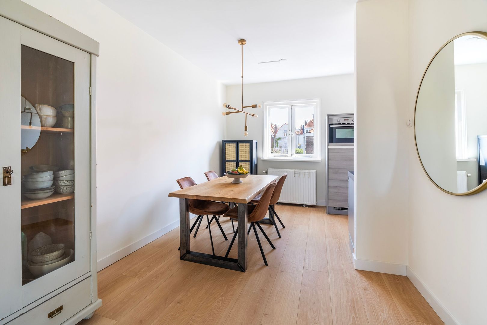 Entree op straatniveau; gang met meterkast en binnentrap naar de eerste etage. Overloop met toegang tot het keurige toilet met fonteintje en opstelplaats voor wasmachine; zeer lichte en sfeervolle L-vormige woon/eetkamer ca. 9.34x4.95/3.07 voorzien van een lichte laminaatvloer, gestuukte wanden en plafond. Aan de achterzijde bevind zich de open keuken met diverse inbouwapparatuur zoals oven, magnetron, koelkast, vriezer, 6-pits gaskookplaat, afzuigkap, vaatwasser; van hier is ook de toegang tot het keurige terras.