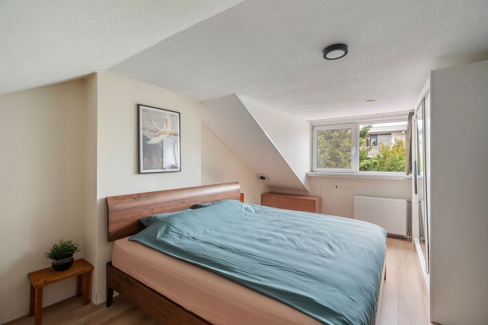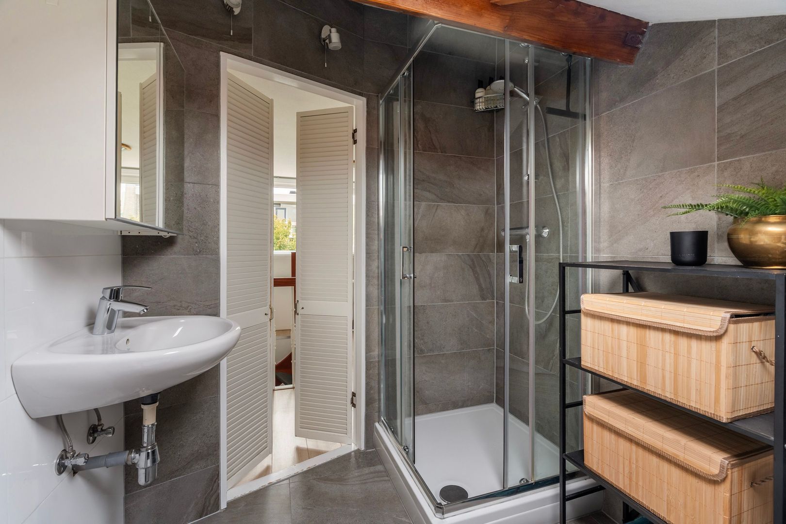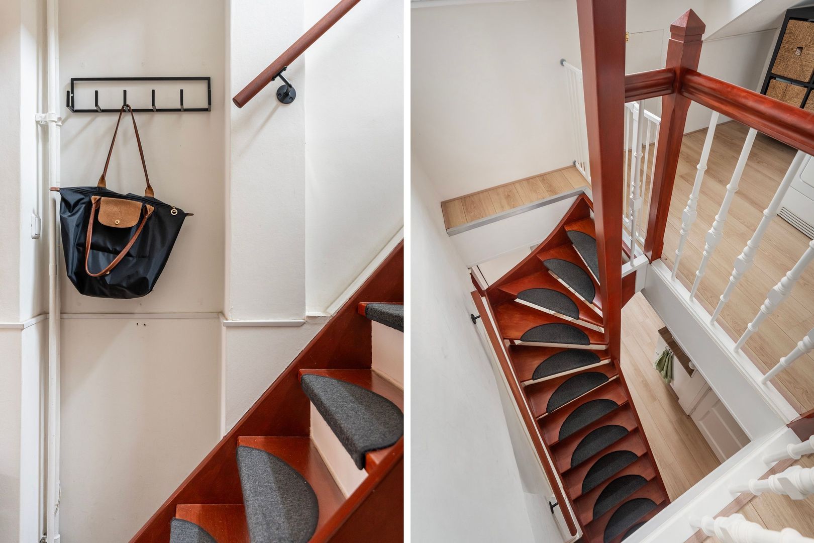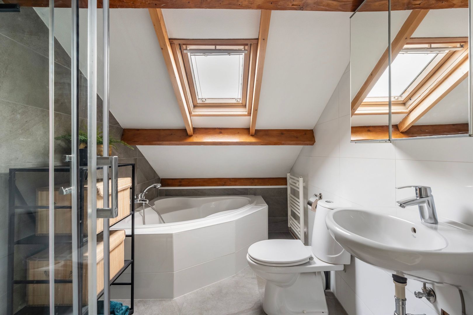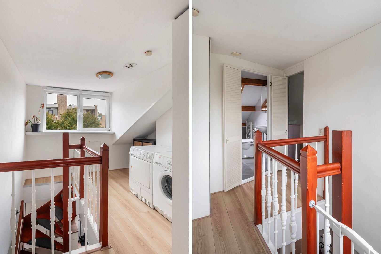 Trap vanuit de hal naar de overloop op de 3e etage; overloop met de wasmachineaansluiting en een vaste kast met de cv-opstelling; ruime 2e slaapkamer met dakkapel; moderne ruime badkamer met een douchecabine, hoekligbad, wastafel en toilet;