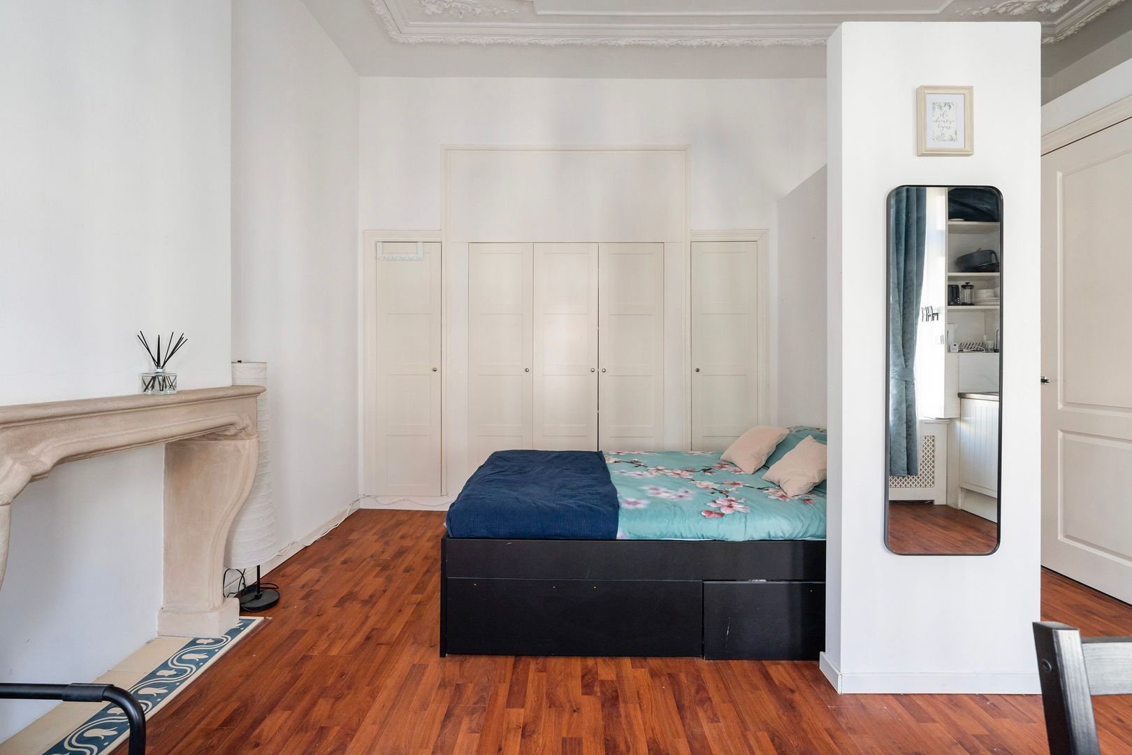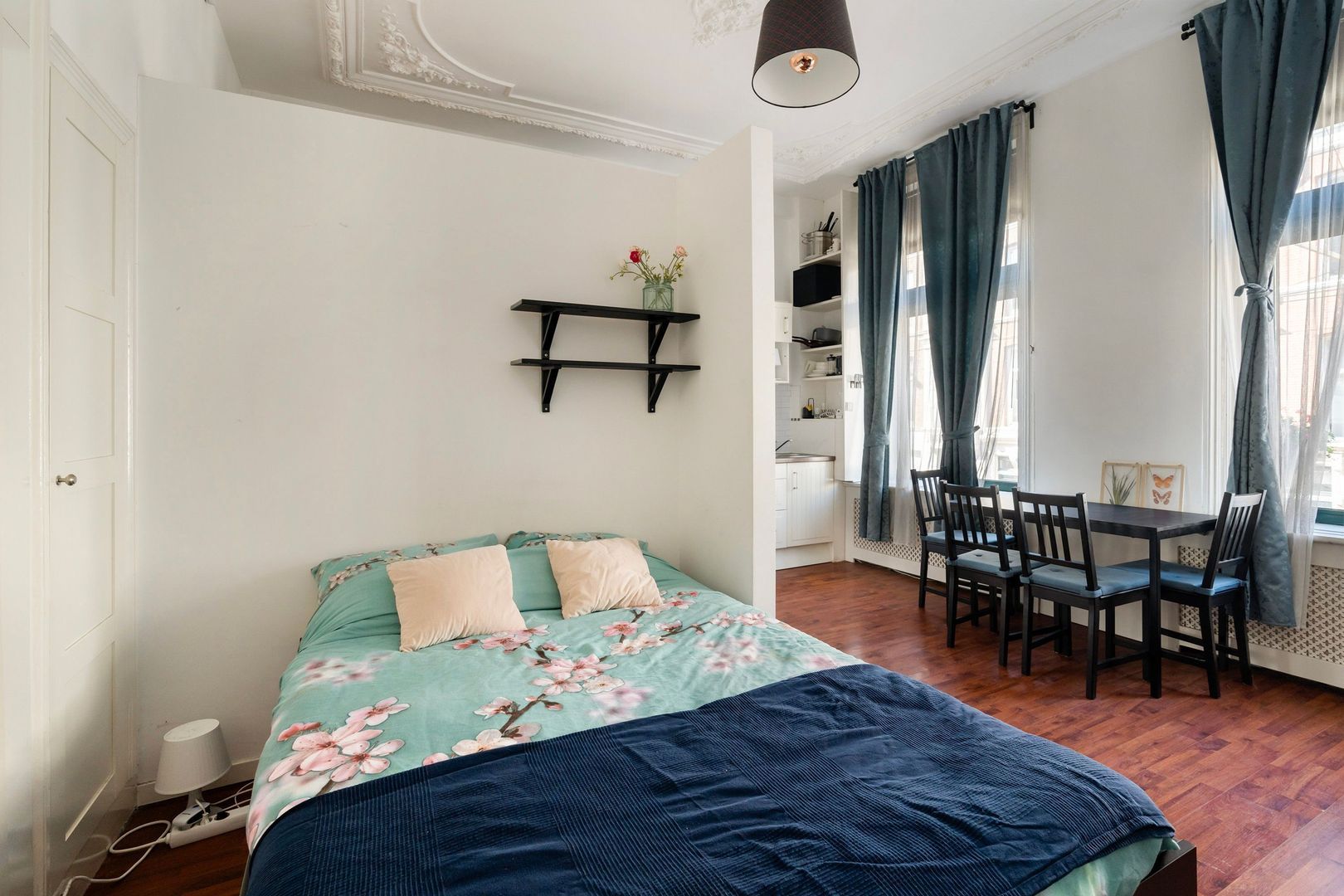 Royaal centraal entree op de begane grond; Trap naar de 1e etage. Entree appartement op de 1e etage aan de voorzijde. Gang; badkamer met douche, toilet en wastafelmeubel; woonkamer met open keuken met voorzien van ingebouwde gaskookplaat, afzuigkap en onderbouw koelkast. Het slaapgedeelte is enigszins afgescheiden van het woongedeelte. Het appartement heeft veel kastruimte, een fraaie schouw en een rijk geornamenteerd plafond.