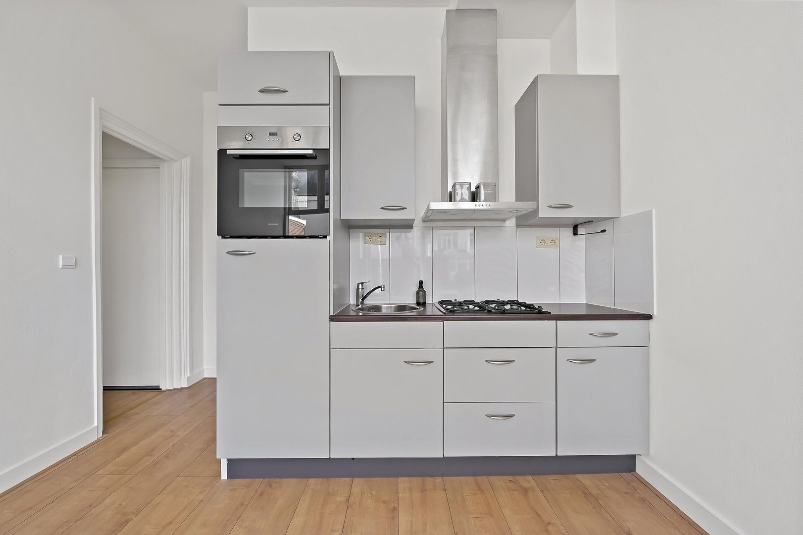 Via de centrale entree op de begane grond bereikt u de trap naar de eerste etage. Het appartement heeft een entree aan de achterzijde op de eerste etage. U komt binnen in een hal met toegang tot de toiletruimte en een kast (CV/bergruimte). Vanuit de hal loopt u door naar een tussenhal die toegang biedt tot de riante woonkamer; De woonkamer is voorzien van een open keuken imet een rvs 4-pits gasfornuis, afzuigkap en koel-/vriescombinatie.