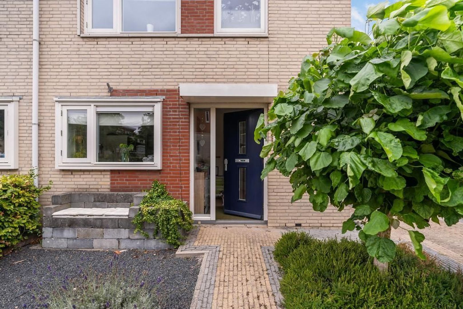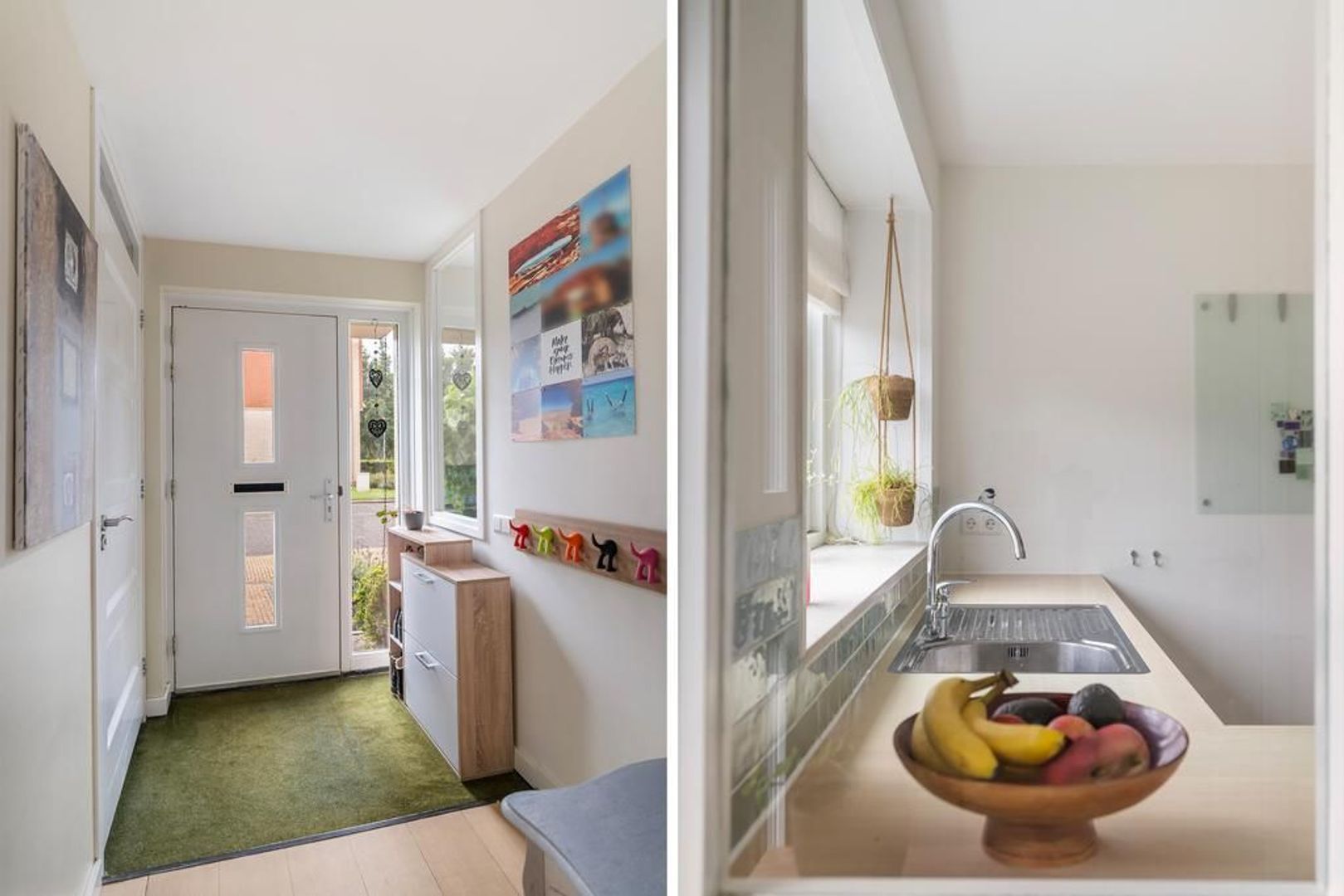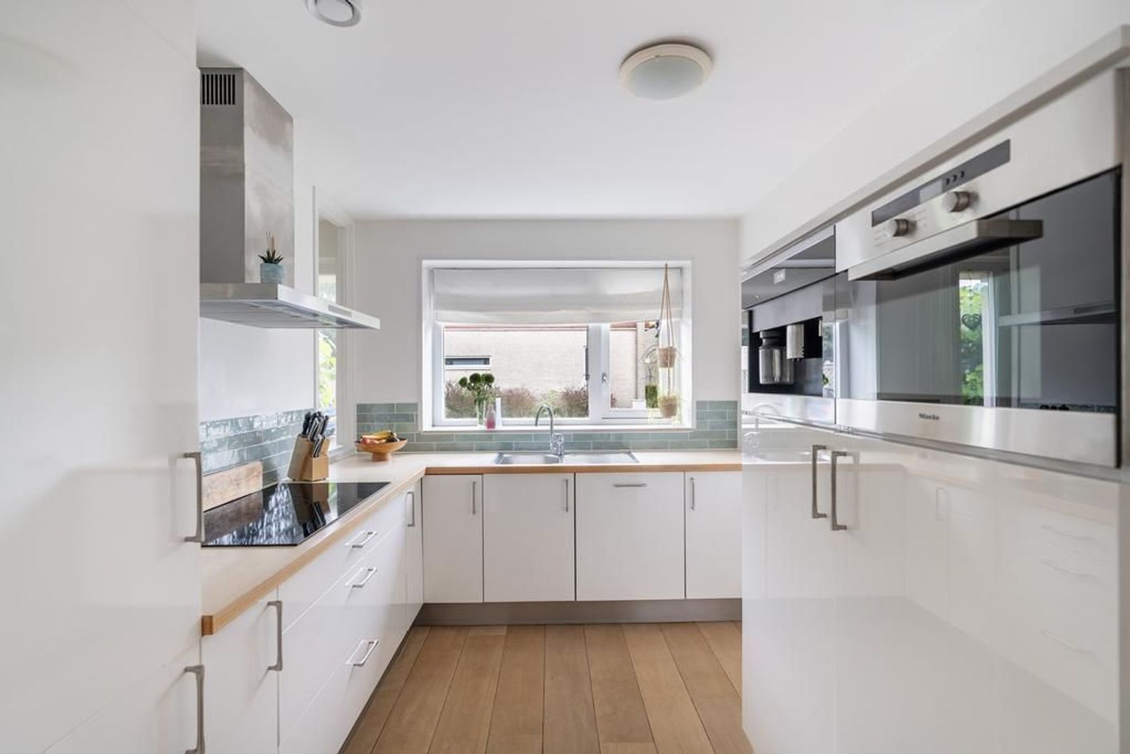 Fraai aangelegde en keurig verzorgde voortuin met eigen oprit; entree woning; ruime hal met meterkast; toilet met fonteintje; trapopgang en deur naar de extra brede woonkamer; de woonkamer heeft zeer veel prettige lichtinval en kent een natuurlijke en rustige uitstraling. De woonkamer grenst aan de open keuken, geplaatst in een hoekopstelling en voorzien van diverse inbouwapparatuur.