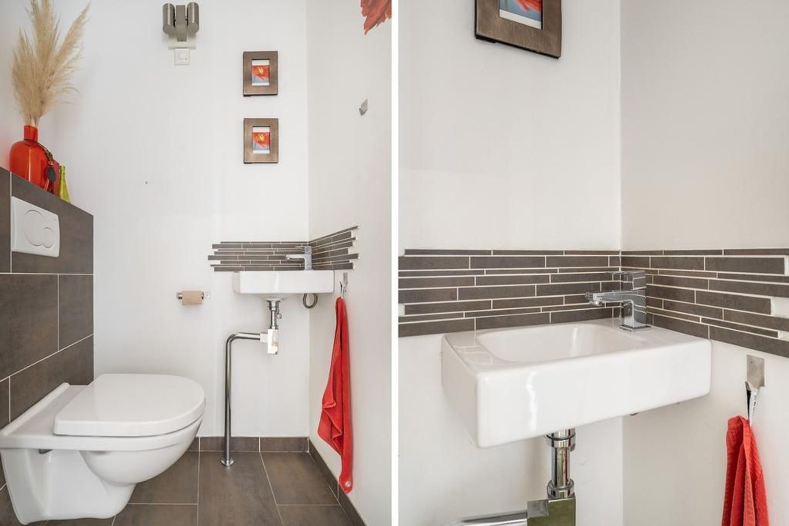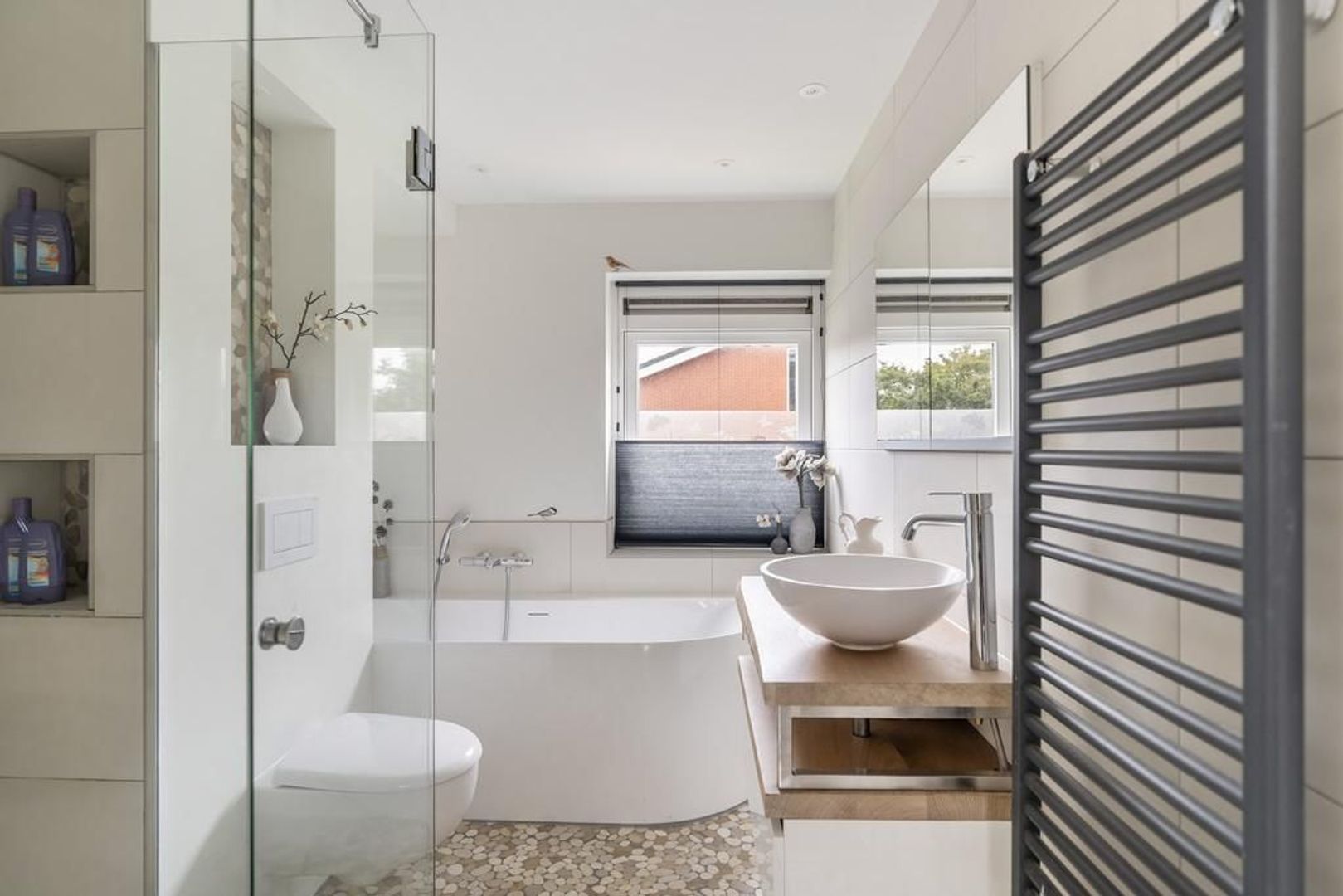 Overloop; 2 slaapkamers aan de achterzijde en 1 slaapkamer aan de voorzijde; moderne badkamer (3 jaar oud) met ligbad, inloopdouche, 2e toilet en modern wastafelmeubel.