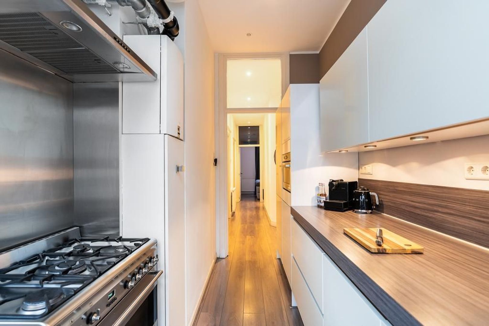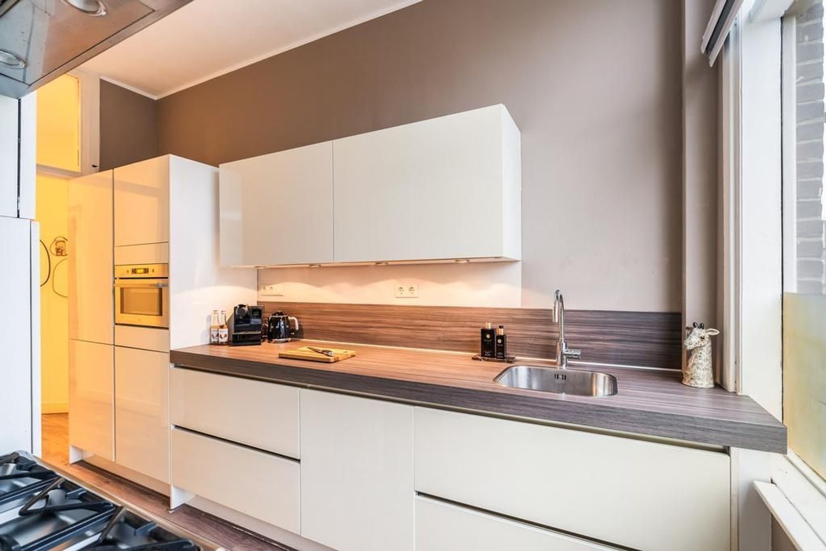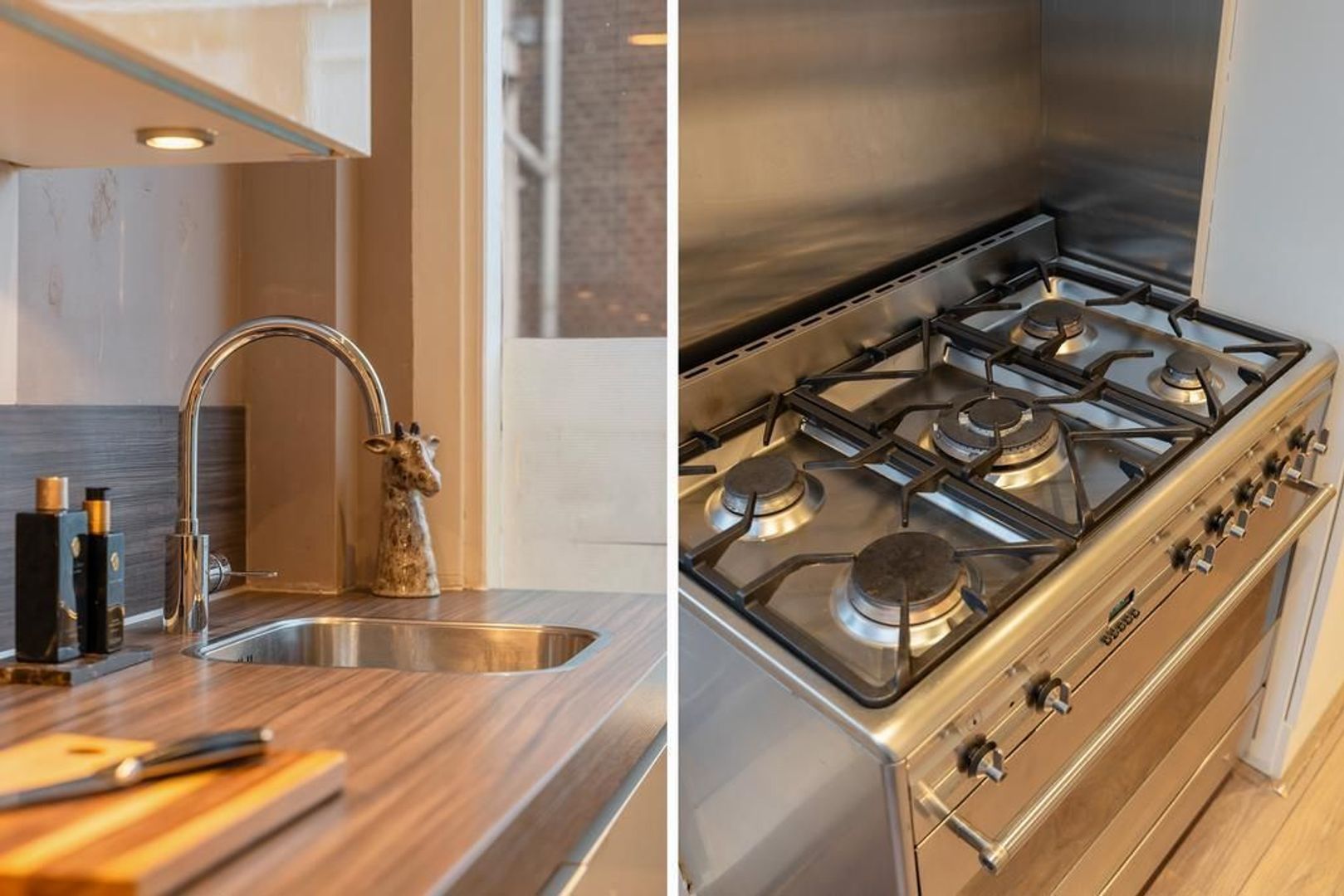 Moderne keuken met veel (greeploze) kasten en werkruimte, brede lade's met binnenlade, geïntegreerde koel-/vriescombinatie, combi magnetron, vaatwasser (2020), afzuigkap, groot rvs gasfornuis met 5 branders en grote oven en toegang tot het balkon aan de achterzijde.