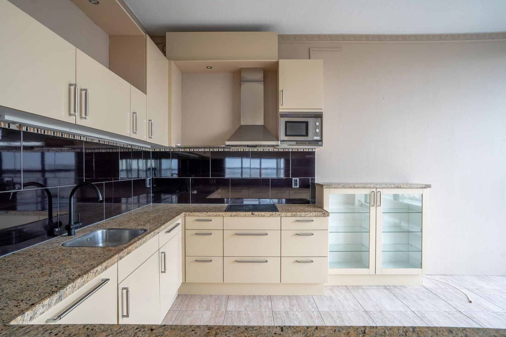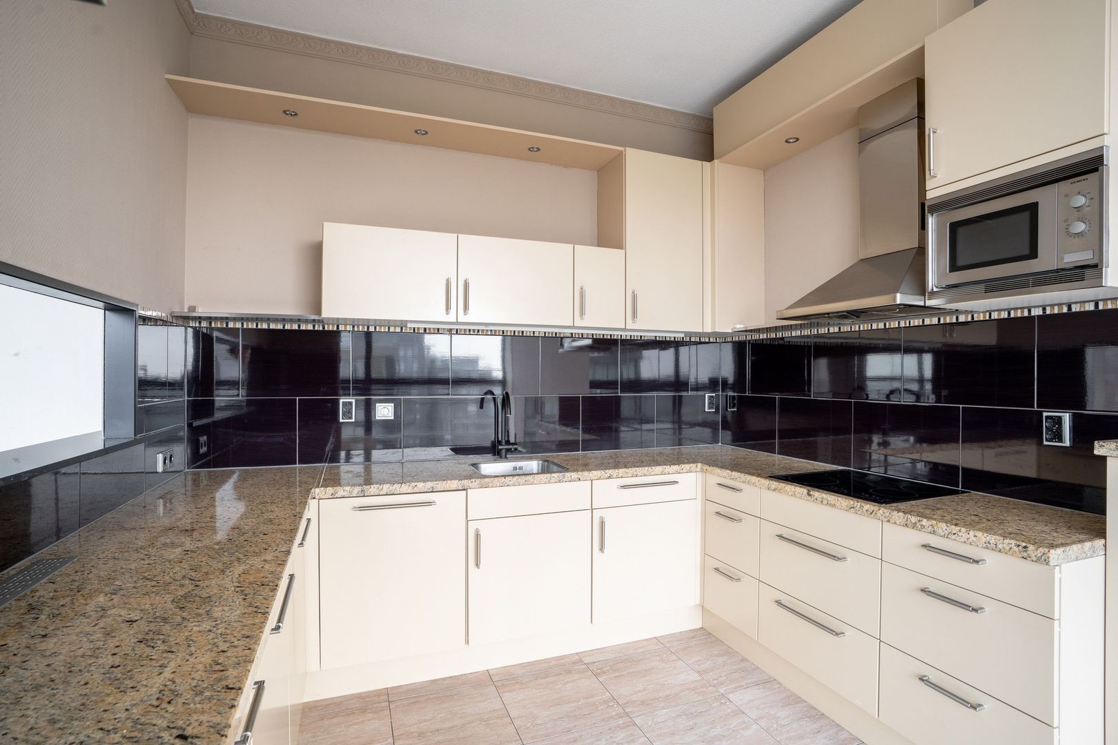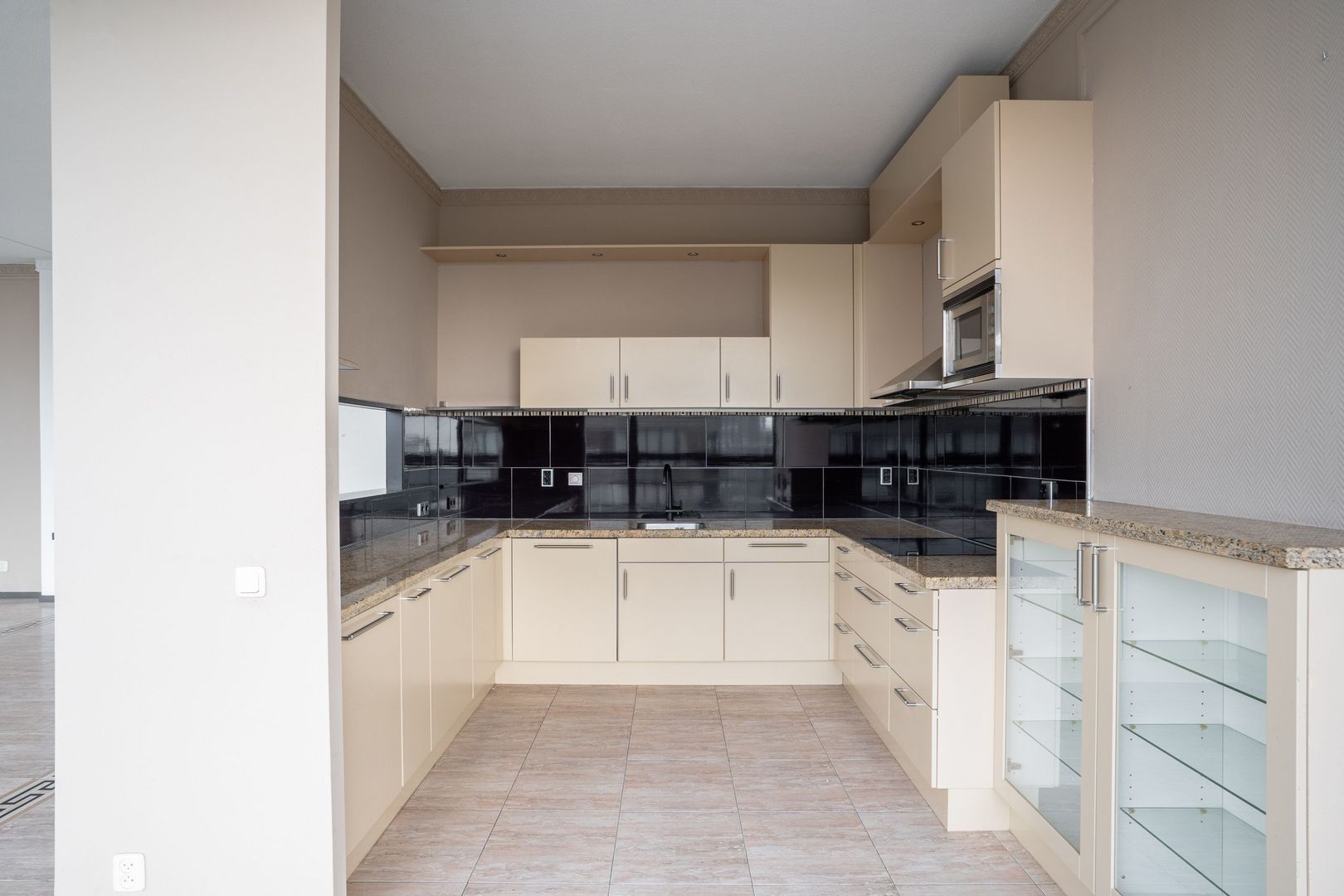 In de woonkamer zit de royale open keuken met alle apparatuur. De complete open keuken is voorzien van een U-vorm opstelling met een marmeren werkblad en inbouwapparatuur zoals; inductie kookplaat; afzuigkap, magnetron en vaatwasser.