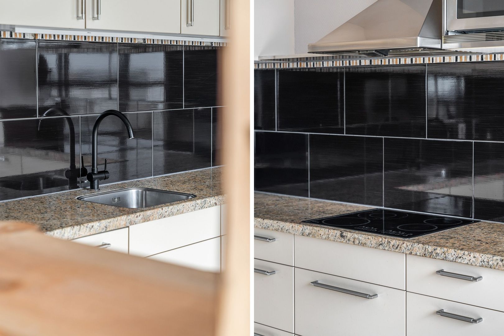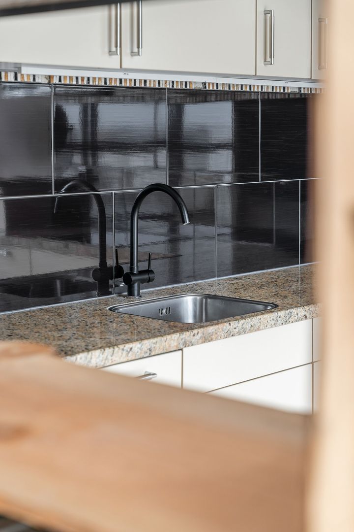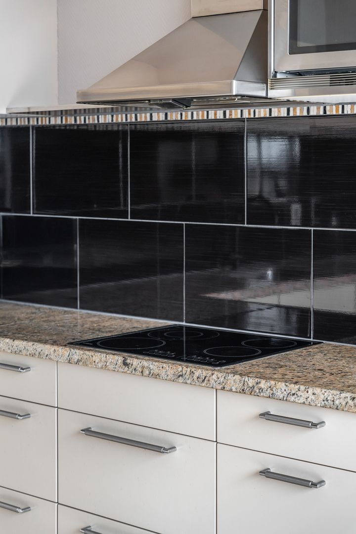 In de woonkamer zit de royale open keuken met alle apparatuur. De complete open keuken is voorzien van een U-vorm opstelling met een marmeren werkblad en inbouwapparatuur zoals; inductie kookplaat; afzuigkap, magnetron en vaatwasser.