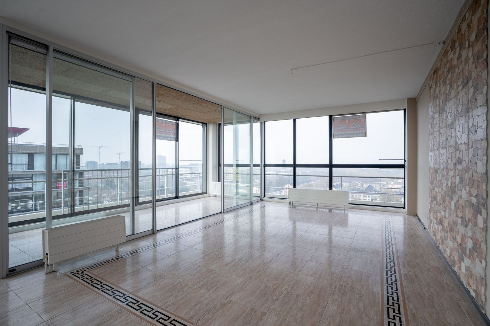 De woonkamer bemeet totaal ca 93m2 en is bijzonder licht door de aan 2 zijden aanwezige grote raampartijen. Deze hoge raampartijen zorgen voor een weids/panorama uitzicht.