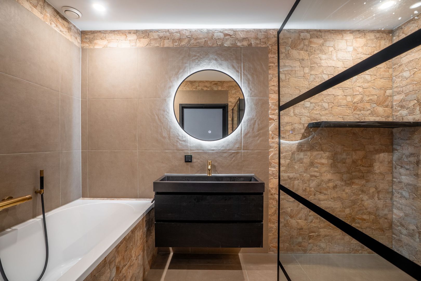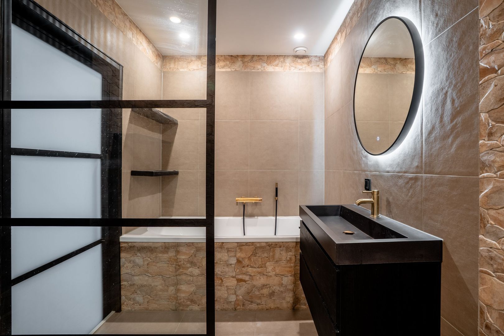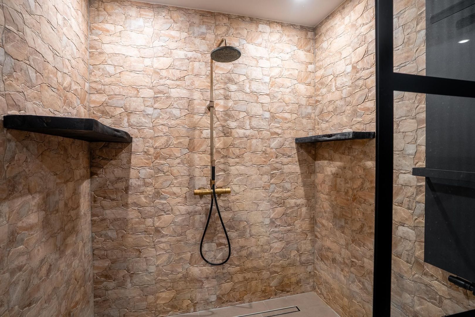 Royale luxe badkamer ca. 7m2 voorzien van een riante inloop douche, een ligbad en een wastafelmeubel