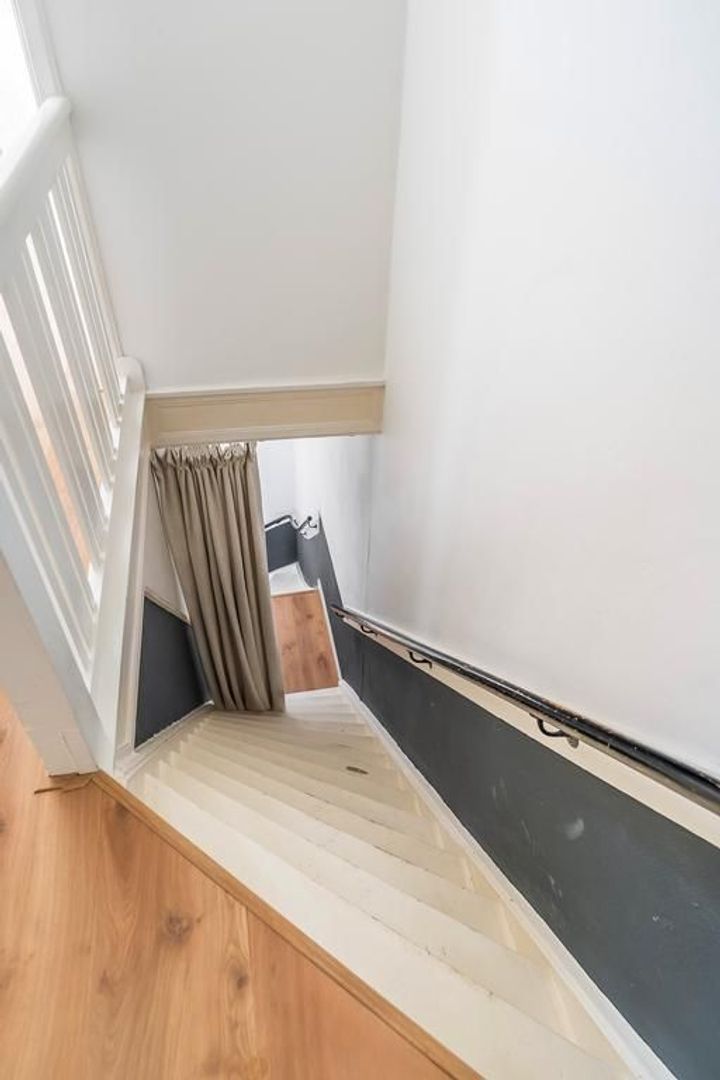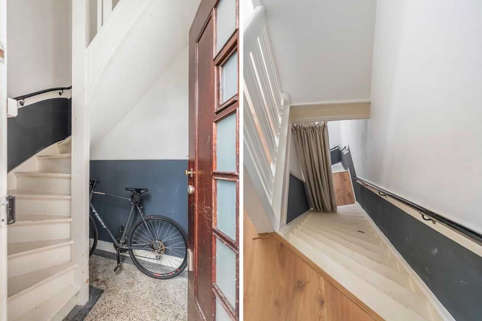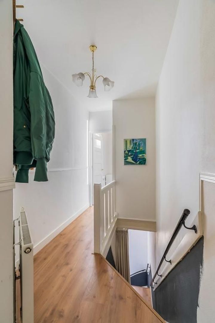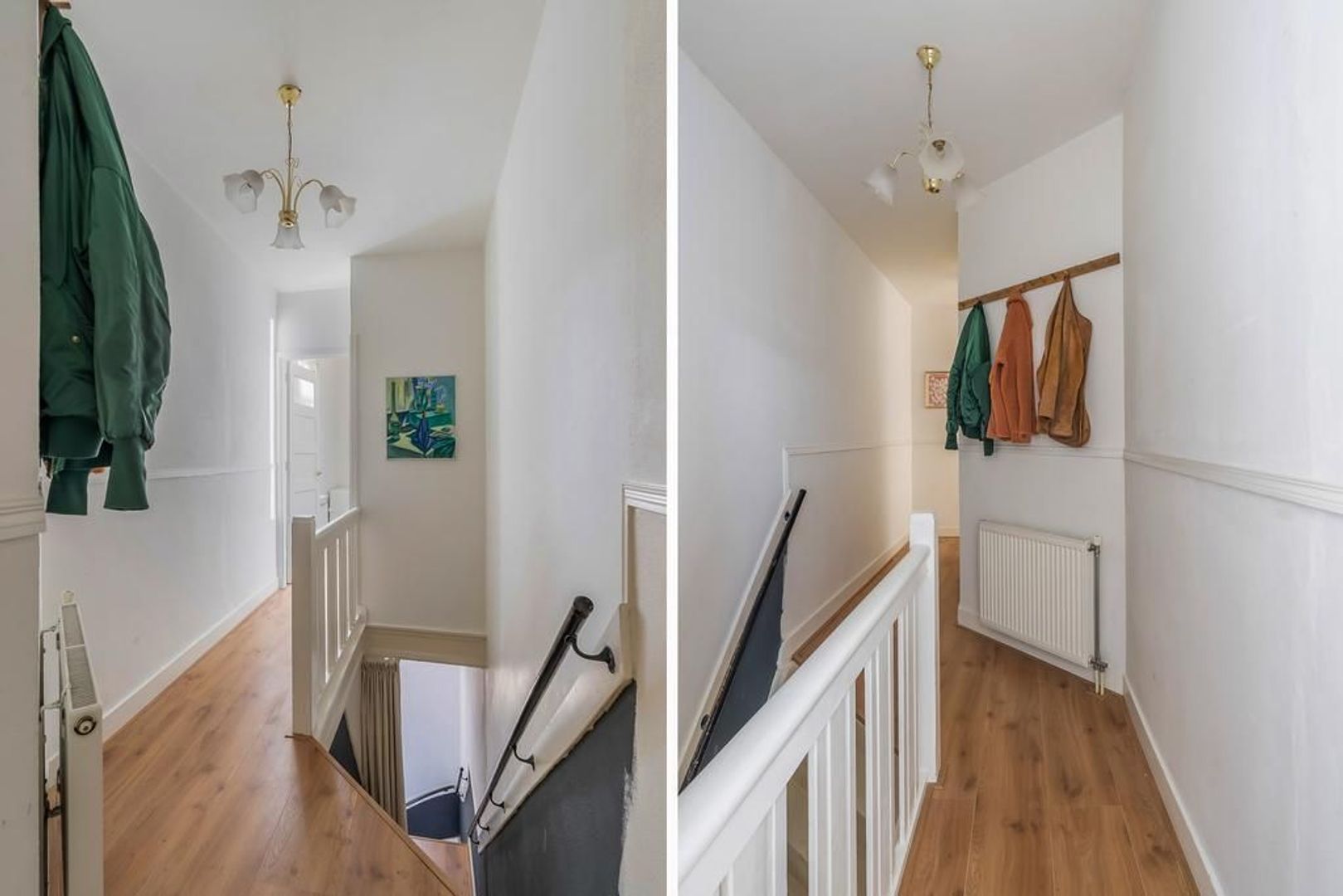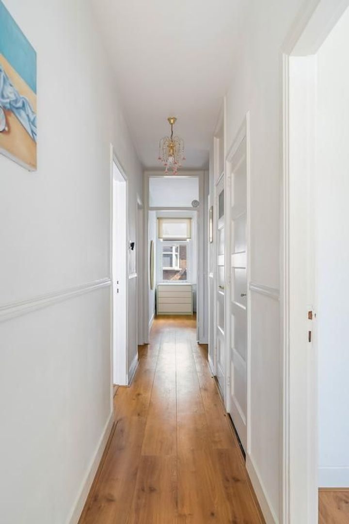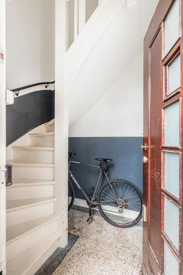 Entree via gezamenlijk voorpad, entree woning op de begane grond met fraaie granito vloer en genoeg bergruimte voor bijvoorbeeld fietsen, trappenhuis met bordes, ophangsysteem voor een fiets en met een grote bergruimte. De overloop op de 2e etage (woonverdieping) heeft een speelse indeling en biedt toegang tot het moderne toilet en tot de aparte ruimte voor de wasmachine/droger. Kamer ensuite met de fraaie schuifseparatie met kasten, die de ruimte verdeelt in een voorkamer met erkerkozijn, schouw (welke beschikt over een rookkanaal voor aansluiting van een houtkachel), een achterkamer met schouw en toegang tot het balkon met middag- en avondzon via de openslaande deuren.
