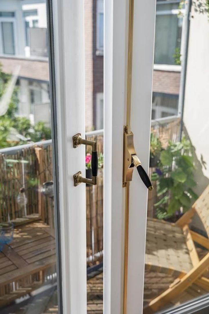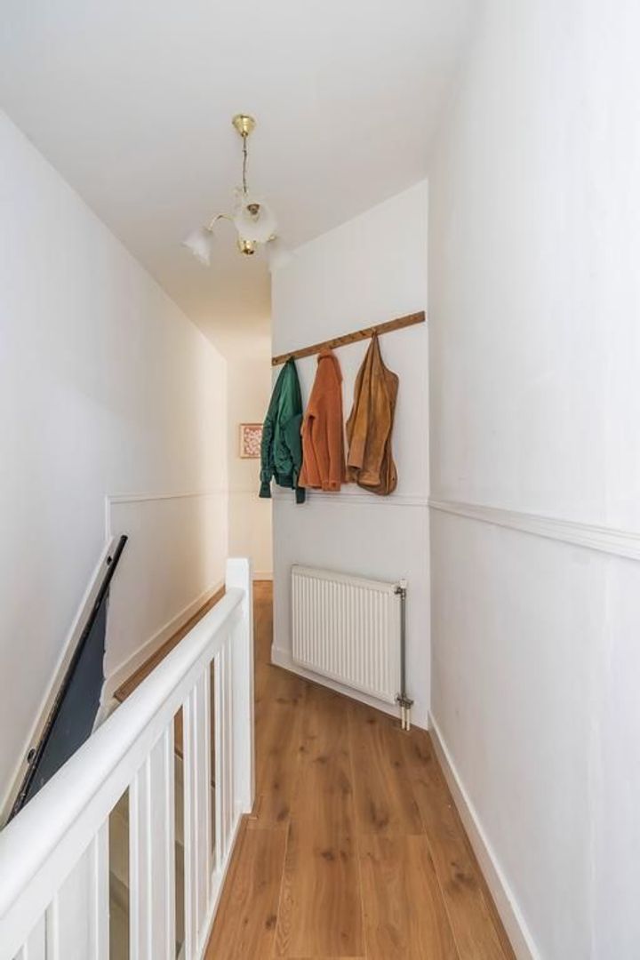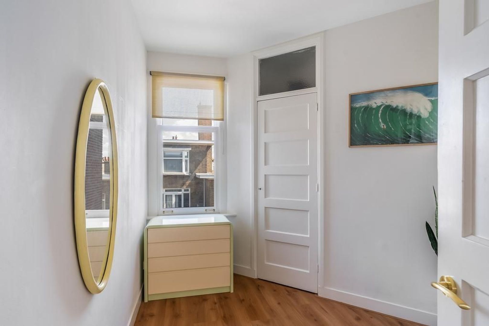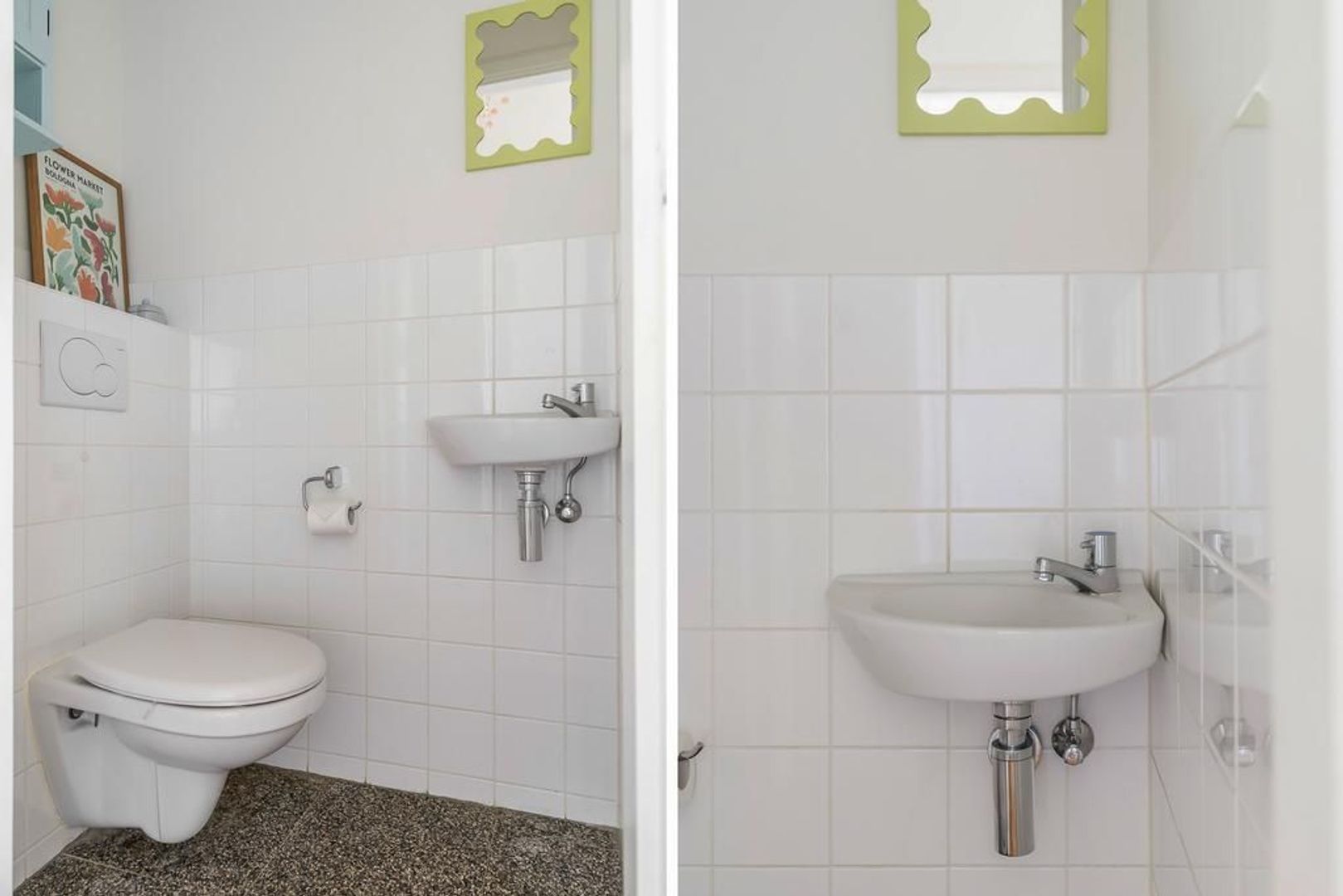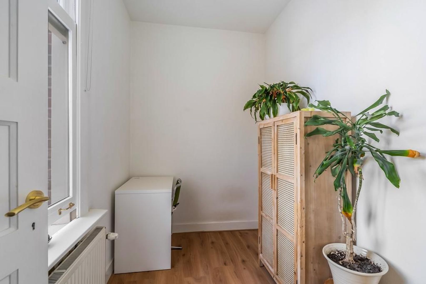 Entree via gezamenlijk voorpad, entree woning op de begane grond met fraaie granito vloer en genoeg bergruimte voor bijvoorbeeld fietsen, trappenhuis met bordes, ophangsysteem voor een fiets en met een grote bergruimte. De overloop op de 2e etage (woonverdieping) heeft een speelse indeling en biedt toegang tot het moderne toilet en tot de aparte ruimte voor de wasmachine/droger. Kamer ensuite met de fraaie schuifseparatie met kasten, die de ruimte verdeelt in een voorkamer met erkerkozijn, schouw (welke beschikt over een rookkanaal voor aansluiting van een houtkachel), een achterkamer met schouw en toegang tot het balkon met middag- en avondzon via de openslaande deuren.