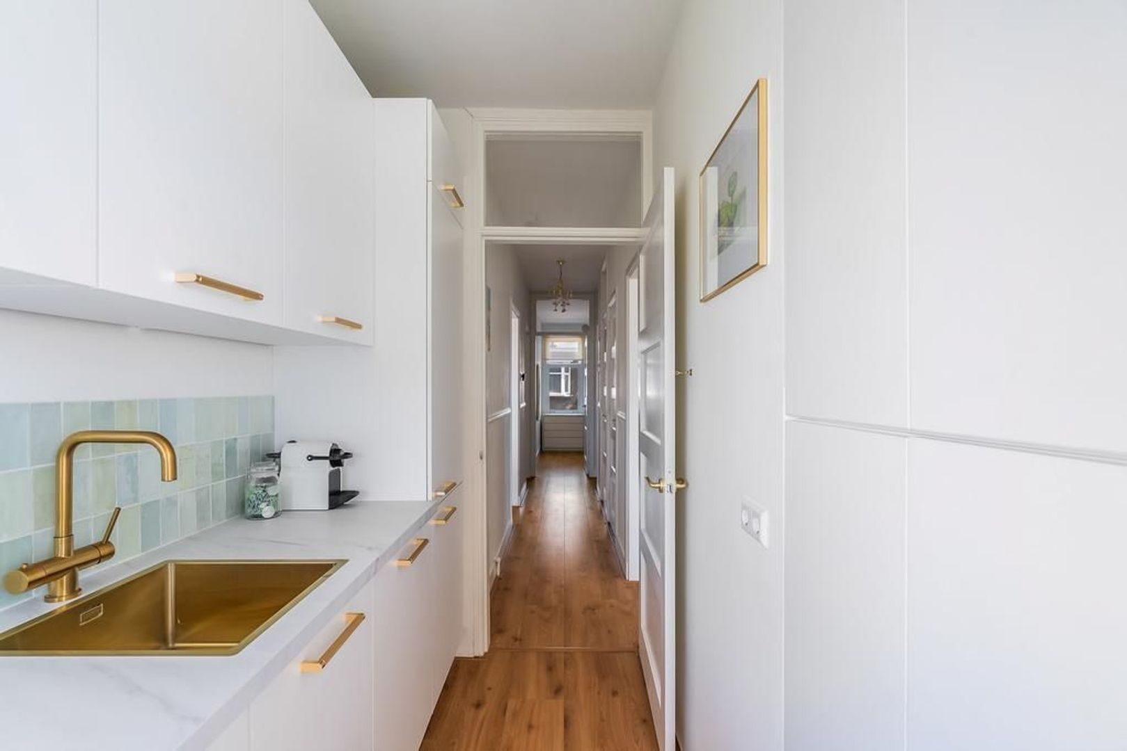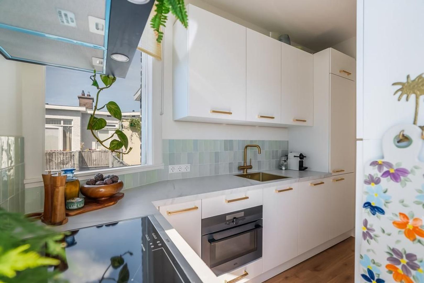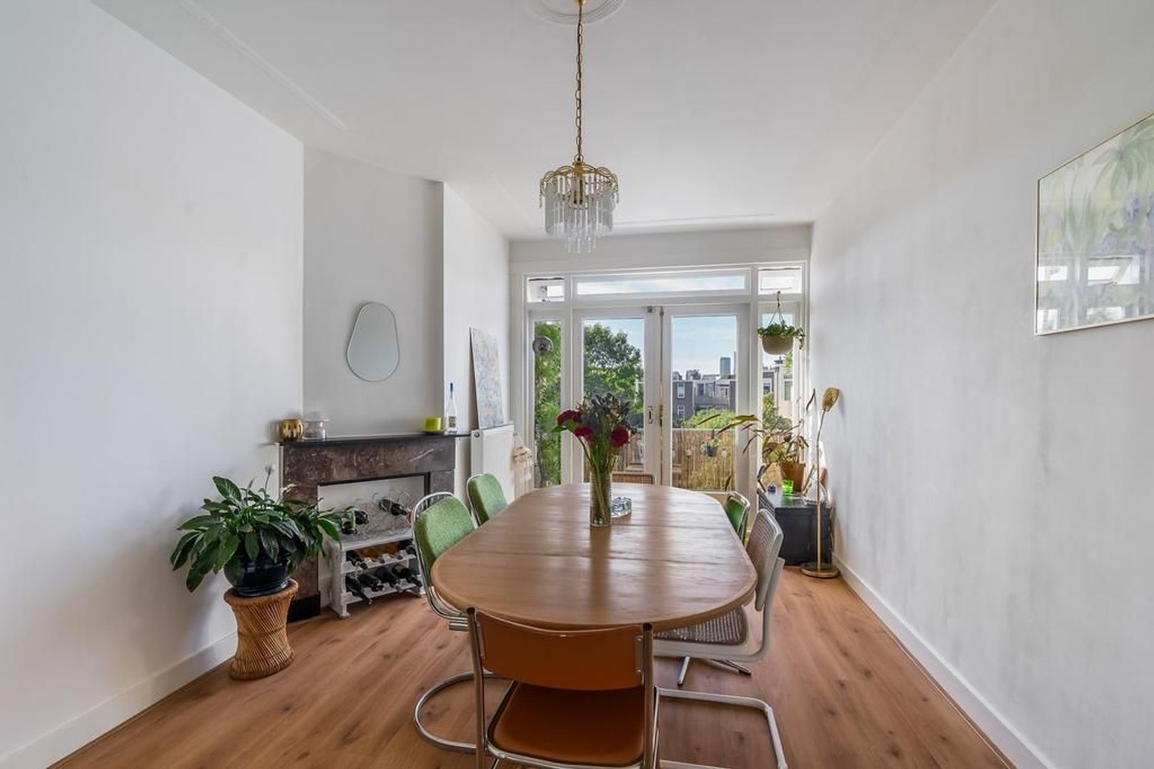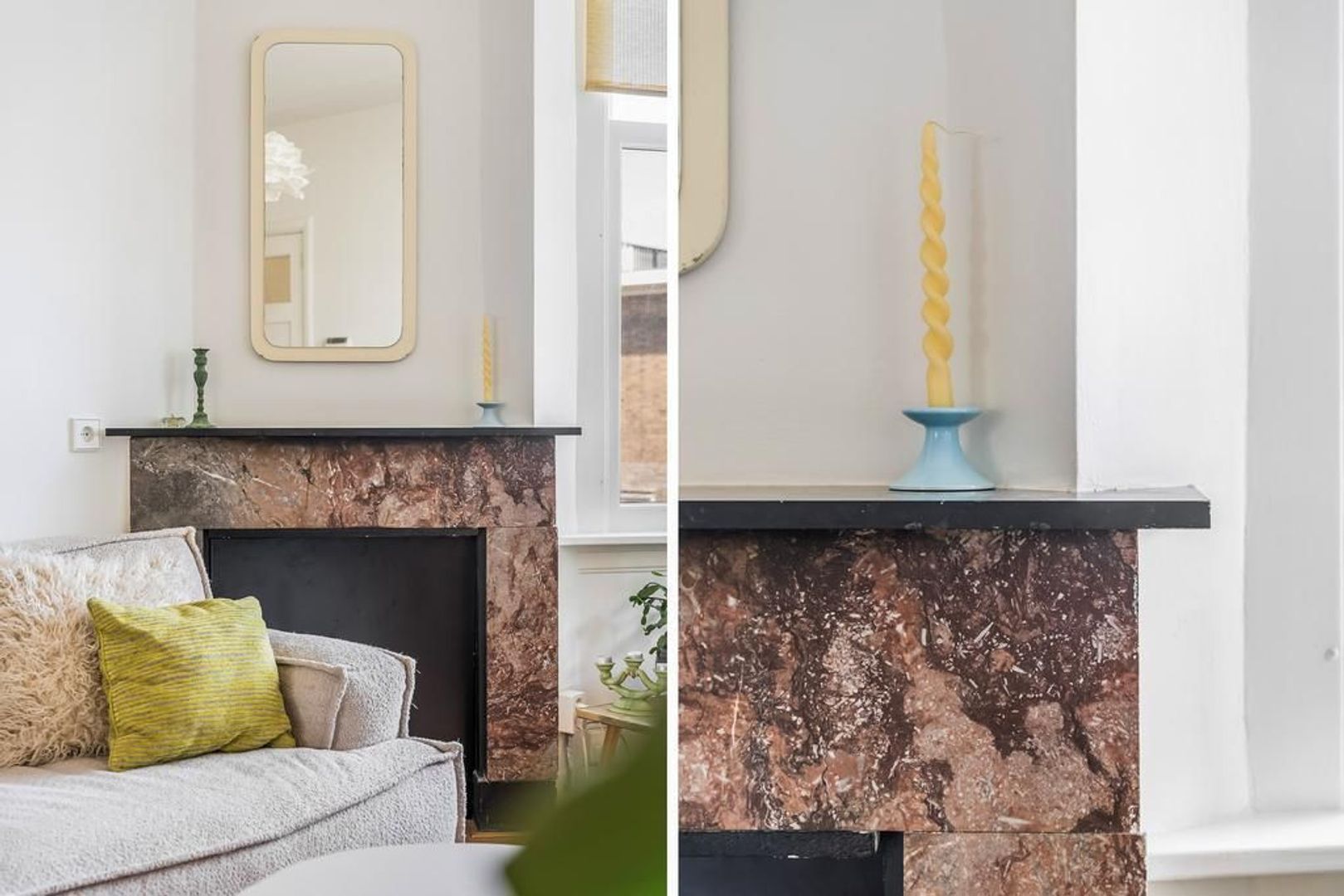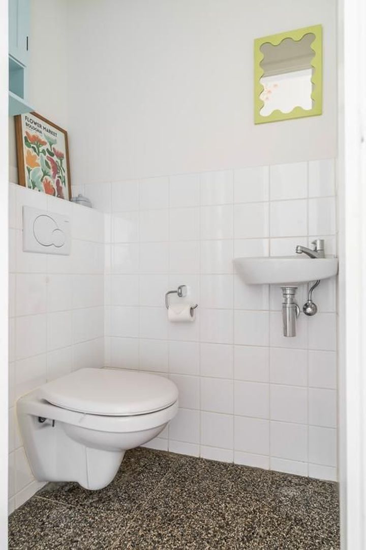 Entree via gezamenlijk voorpad, entree woning op de begane grond met fraaie granito vloer en genoeg bergruimte voor bijvoorbeeld fietsen, trappenhuis met bordes, ophangsysteem voor een fiets en met een grote bergruimte. De overloop op de 2e etage (woonverdieping) heeft een speelse indeling en biedt toegang tot het moderne toilet en tot de aparte ruimte voor de wasmachine/droger. Kamer ensuite met de fraaie schuifseparatie met kasten, die de ruimte verdeelt in een voorkamer met erkerkozijn, schouw (welke beschikt over een rookkanaal voor aansluiting van een houtkachel), een achterkamer met schouw en toegang tot het balkon met middag- en avondzon via de openslaande deuren.