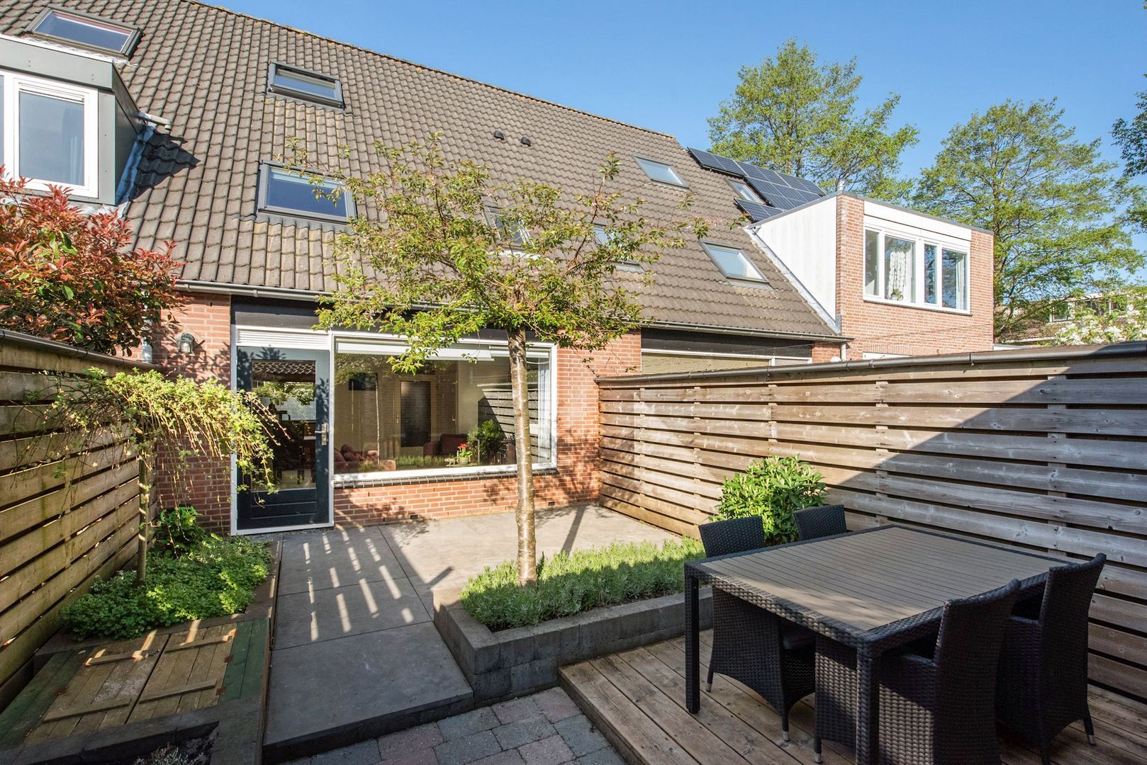 Tuin: De achtertuin is eveneens fraai aangelegd met vaste groenborders en 2 terrassen. Achterin staat de schuur, met aangrenzende overkapping met pannendak. De tuin is ook bereikbaar via een achterom.